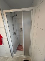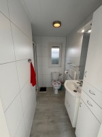 • badkamer met wasmeubel, toilet, design radiator en doucheruimte met thermostaat kraan.